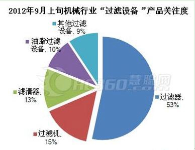 從2012年9月上旬,我國(guó)“過濾設(shè)備”的交易指數(shù)可以看出,過濾器以53%的消費(fèi)指數(shù)占據(jù)過濾設(shè)備市場(chǎng)的半壁江山。而過濾機(jī)市場(chǎng)份額僅有15%的占有率,可見,過濾器的