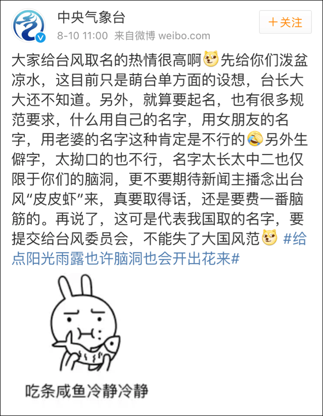 轉(zhuǎn)發(fā)10萬,評(píng)論3萬,網(wǎng)友們紛紛提出了“皮皮蝦”“包郵”“二狗子”等凝聚了群眾智慧的名字。鬧得氣象臺(tái)不得不站出來讓大家嚴(yán)肅點(diǎn)。